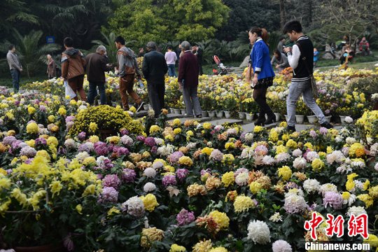 11月18日,成都人民公园摆放的800余个品种共5万多盆菊花吸引市民观赏。中新社发 张浪 摄
