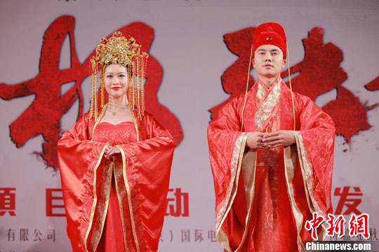 11月18日,三十集古装武侠历史剧《新太极张三丰》项目启动发布会在北京举行。图为主创演员亮相。中新社发 李学仕 摄