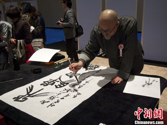 图为陕西书法家现场题字。中新社发 孙冉 摄