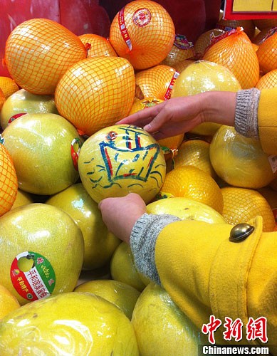 11月19日,山西省太原民众在超市选购“创意柚子”。中新社发 张怡 摄