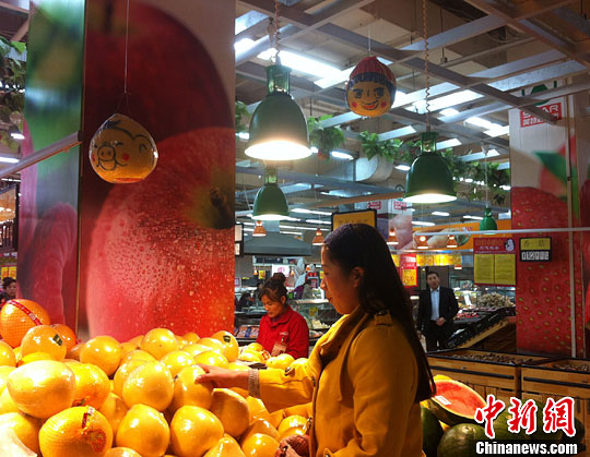 11月19日,山西省太原民众在超市选购“创意柚子”。中新社发 张怡 摄