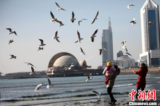 11月19日,青岛前海海边,市民与游客在喂食海鸥,与海鸥一起拍照,喜迎海鸥归来。中新社发 徐崇德 摄