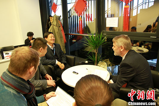 图为华沙气候大会中国代表团新闻负责人、国家发改委政研室副主任文步高与慕尼黑大学新闻传播学教授Hartmut Wessler等人交流。