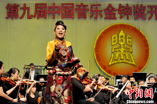 11月19日晚,第九届中国音乐金钟奖开幕式音乐会在广州大剧院隆重举行。著名歌唱家拥江帆带来了女声独唱《跑马山情思》。中新社发 刘卫勇 摄