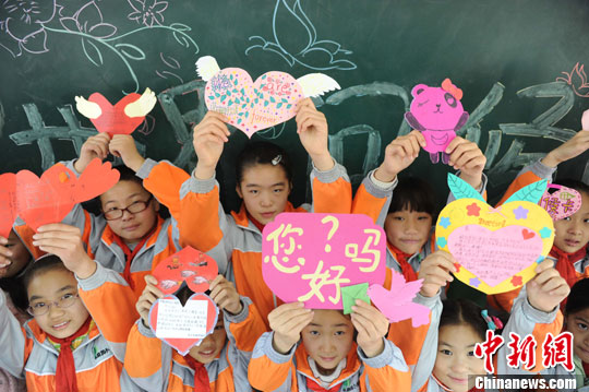 11月20日,安徽合肥笔架山街道翠庭园小学开展“今天您问候了吗”世界问候日主题活动,活动中小学生们将内心想说的问候语通过自己亲手制作的贺卡、漫画表达出来,为身边的人及灾区小朋友送去温馨祝福,迎接即将到来的世界问候日。中新社发 张娅子 摄