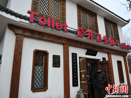 11月20日,市民经过仿古厕所。沈阳街头的这座仿古厕所,门口挂上对联,“书香气十足”引人侧目。中新社发 于海洋 摄