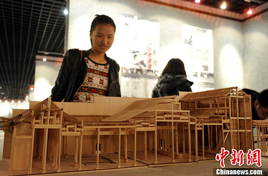 11月20日,纽约曼哈顿金融中心、古徽州庭院等比例缩小版建筑亮相合工大学生设计竞赛获奖作品展。中新社发 韩苏原 摄