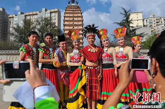 图为云南少数民族演员与亚洲各国艺术家合影。中新社发 任东 摄