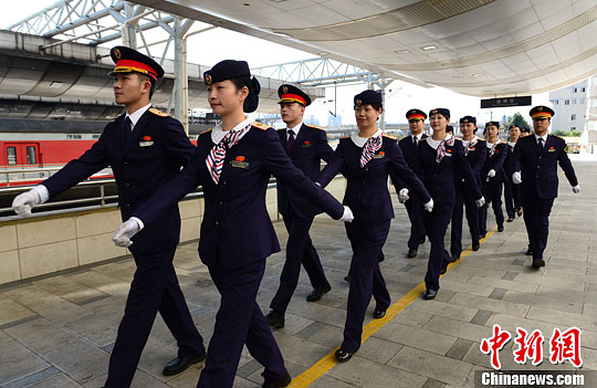 图为身着新制服的乘务员进行出乘队列训练。中新社发 汪建云 摄