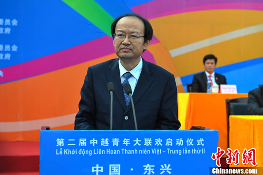 11月24日上午,第二届中越青年大联欢在广西东兴启动。中国共青团中央书记处书记周长奎、越南胡志明共青团中央书记处书记阮孟勇、广西壮族自治区副主席张晓钦出席活动并致辞。图为中国共青团中央书记处书记周长奎致辞。洪坚鹏 摄