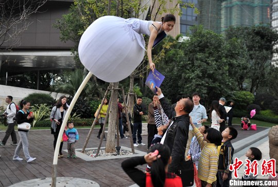 11月23日,福州街头,一位高高在上的美女向行人发放房地产宣传单,吸引路人目光。中新社发 吕明 摄