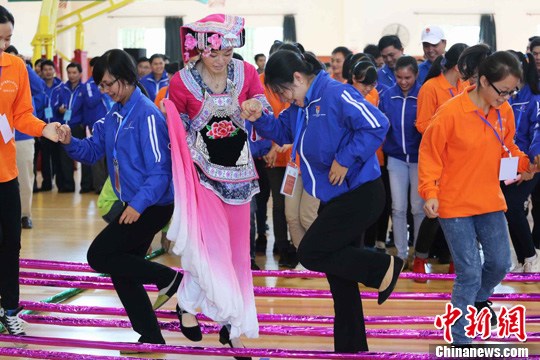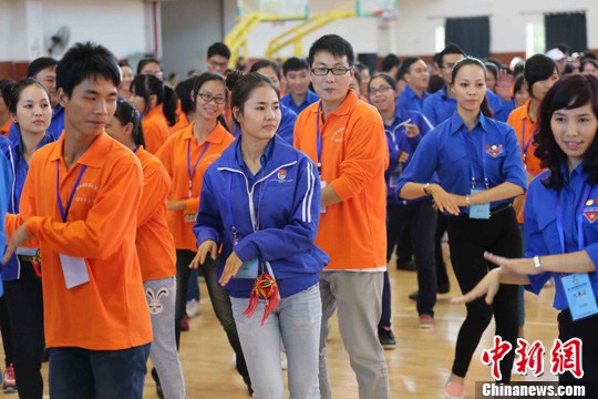11月24日,以“放飞青春梦想,共创美好未来”为主题的第二届中越青年大联欢在广西启动。图为活动中,越南青年与壮族姑娘一起跳竹篙舞。 李俊锋 摄