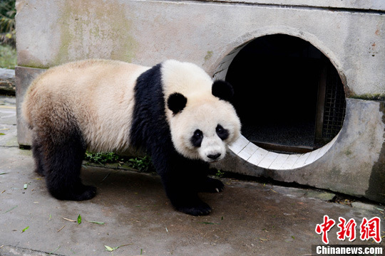 11月24日,泰国政府、动物园组织、泰国驻成都总领馆组成的20余人的探访团来到中国保护大熊猫研究中心雅安基地海归大熊猫园探望大熊猫林冰。图为海归大熊猫“林冰”。中新社发 邱宇 摄