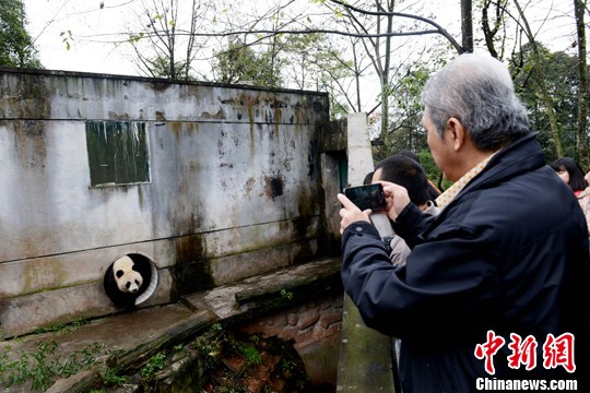 图为 “林冰”粉丝组成的探访团在中国保护大熊猫研究中心探望海归大熊猫“林冰”。中新社发 邱宇 摄