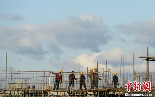 11月25日,北京海淀一处建筑工地工人们在晨光中施工。当日,降温后的北京天气晴好,空气质量为优。中新社发 廖攀 摄