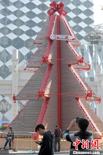 11月25日,距离圣诞节还有一个月时间,一棵由易拉罐拼成的圣诞树矗立在湖北武汉楚河汉街广场上,市民们感觉圣诞的脚步越来越近了。中新社发 张畅 摄