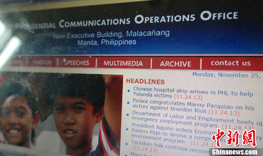 11月25日,菲律宾总统府官方网站在“总统府新闻传播办公室”页面导读区刊发“中国医院船抵达菲律宾帮助台风伤员”消息。中新社发 张明 摄