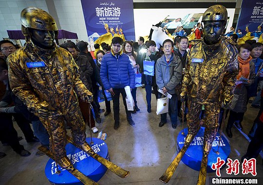 图为两名工作人员装扮成“滑雪雕塑”吸引参观者。刘新 摄
