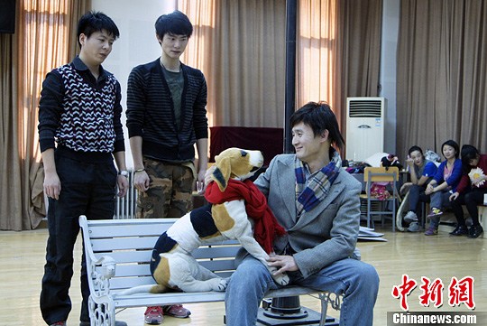 11月29日,人偶话剧《轻轻飘落的红围巾》演员在排练。当日,天津人民艺术剧院在光华剧院三楼会议室召开人偶话剧《轻轻飘落的红围巾》新闻发布会。该剧讲述了一个“人与狗”之间感人至深的故事。中新社发 张道正 摄