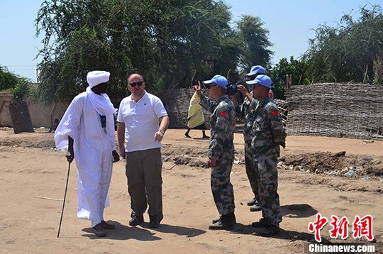图为部落长老看望维和官兵。中新社发 王在奇 摄