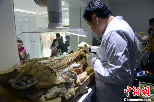2月2日,全国首家虚拟考古体验馆在成都开始试运行。图为文物专家在文物医院内对观众展示文物修复。张浪 摄