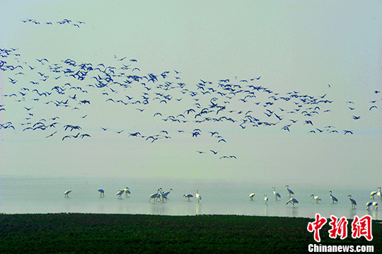 连日来,大批珍贵迁徙鸟类飞抵江西省永修县吴城鄱阳湖候鸟保护区大湖池越冬,湖区呈现出一派万鸟翔集的壮丽景象。中新社发 杨佐桓 摄