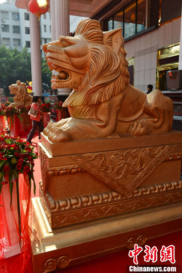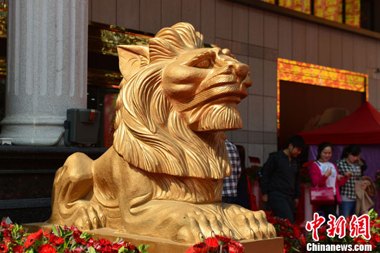 12月4日,两座“土豪金”狮子雕塑在厦门一家新开业商城门前迎客,令人眼前一亮。吕明 摄