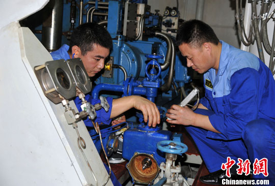 图:“远望6号”轮机部门船员检修机舱设备挥汗如雨