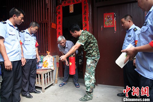 图为义务消防队员走街串户消防消防知识。周杨东 摄