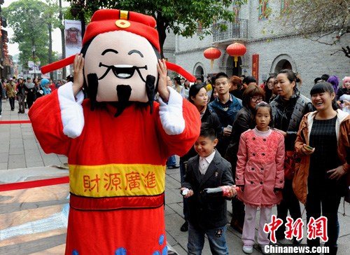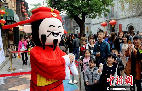 12月7日,“财神”在福州街头做出各种憨态可掬的动作,“卖萌”为民众送祝福。当日,是中国农历二十四节气之一的大雪。中新社发 刘可耕 摄