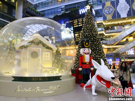 12月9日,北京一商场内设置水晶球、圣诞树等圣诞节装饰,吸引市民拍照留影。中新社发 李慧思 摄