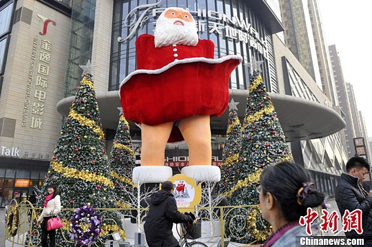12月10日,在山西太原街头,一个巨型梦露版的圣诞老人吸引了不少路人围观。这个圣诞老人造型独特,礼裙形似被风扬起,露出大腿和黑色底裤,过往民众称这是个非常性感的圣诞老人。中新社发 韦亮 摄