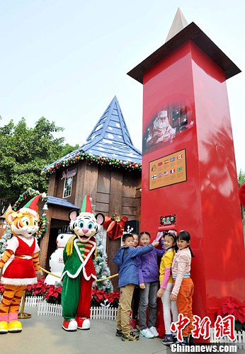 12月10日,重2吨的圣诞邮筒在广州长隆欢乐世界亮相,来长隆欢乐世界的游客均可通过该圣诞邮筒向芬兰圣诞老人寄信,幸运游客会收到芬兰圣诞老人的亲笔回信。图为游客向该圣诞邮筒投入信件。中新社发 刘卫勇 摄