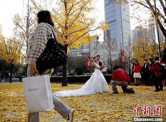 12月10日,几个小朋友在上海音乐厅前落满银杏叶的广场上玩耍。 该广场落满黄色的银杏叶,犹如巨大的金色“地毯”,吸引市民驻足。中新社发 袁婧 摄