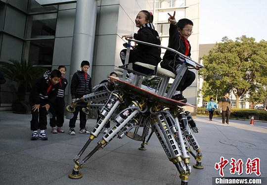 12月10日,在上海科技馆举行的科普讲堂上,一群儿童与一台机器人来了个“亲密接触”,近距离感受机器人的魅力。中新社发 汤彦俊 摄