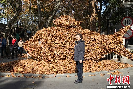 12月10日,一条用梧桐落叶做成的“大金鱼”出现在中国美院门口,吸引了过往行人争相拍照留影。保安说,这是两名美院的学生花了一个晚上完成的作品。中新社发 江志清 摄