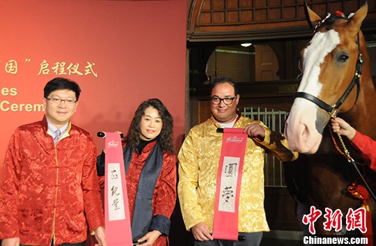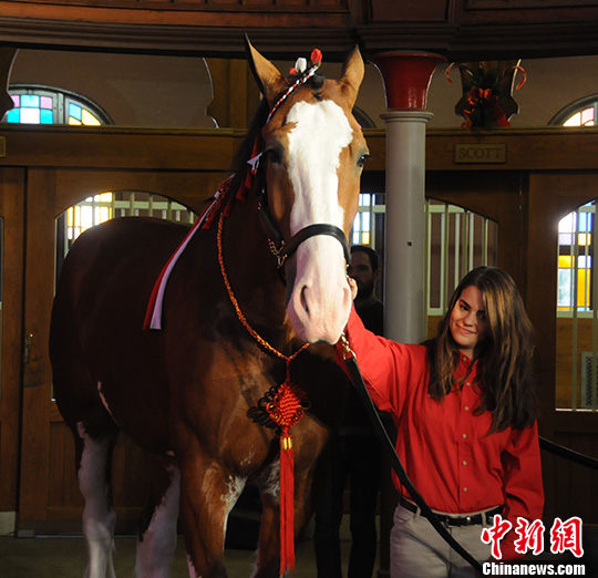 当地时间12月10日,在位于密苏里州圣路易斯市的百威啤酒厂,头戴中国结的美国宝马克莱兹代尔马正式启程,准备首次“跨过”太平洋,与欢庆马年的中国民众见面。之誉。中新社发 德永健 摄