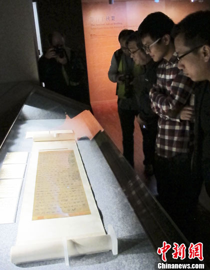 图为观看表演后,观众在台北故宫参观《唐褚遂良黄绢本兰亭》真迹。中新社发 叶小刚 摄