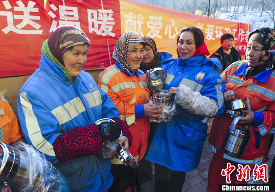 12月11日,新疆乌鲁木齐市沙依巴克区的一线环卫工人收到暖心礼物——保温饭盒,帮助他们解决午饭保温问题。中新社发 刘新 摄