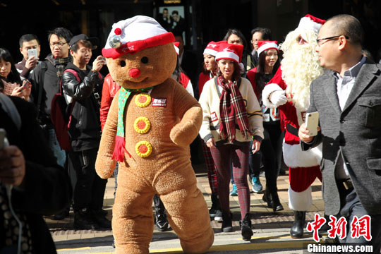 12月19日,一众舞蹈员连同“姜饼人”快闪香港街头,预演“广东道圣诞倒数派对”。中新社发 洪少葵 摄