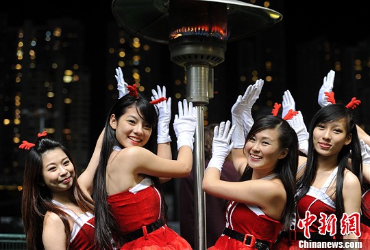 12月19日,参加室外演出的姑娘们在香港一场表演间隙烤火取暖。香港近日持续寒冷。中新社发 张宇 摄