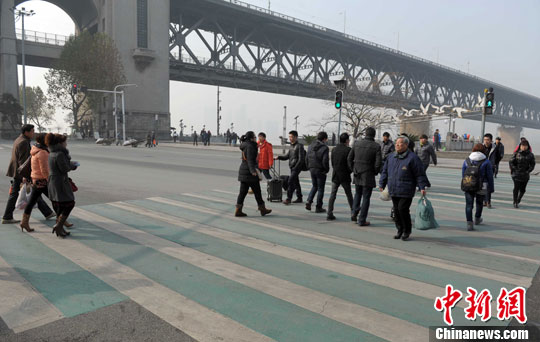 12月21日,位于武汉长江大桥武昌江滩的斑马线一改往日单调的白色,被刷成绿白相间的颜色非常醒目,时刻提醒行人过街要走斑马线,更能有效提醒过往司机减速慢行,道路上多了一份色彩,更多了一份关怀。中新社发 张畅 摄