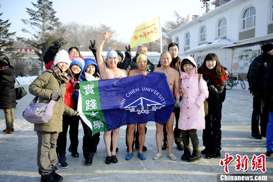 图为当日,室外温度达零下15摄氏度,台湾学生穿着厚厚冬装,看着冬泳爱好者在水中嬉戏,不断发出惊叹。中新社发 张瑶 摄