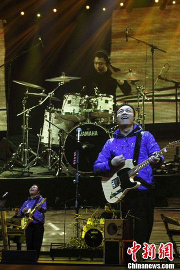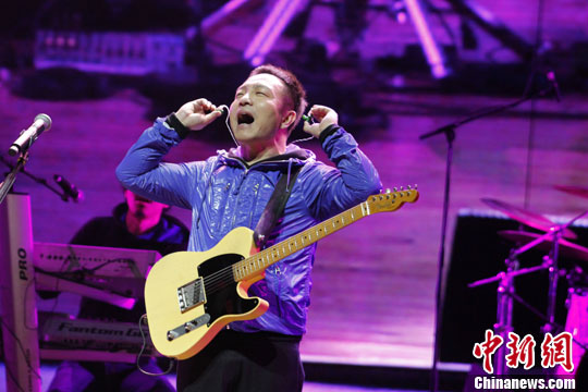 12月25日晚,许巍及他的乐队来到天津欢乐谷Live Show圣诞音乐盛典献唱,一首首经典曲目让现场的歌迷与他一起在歌声里漫步怀旧。中新社发 佟郁 摄