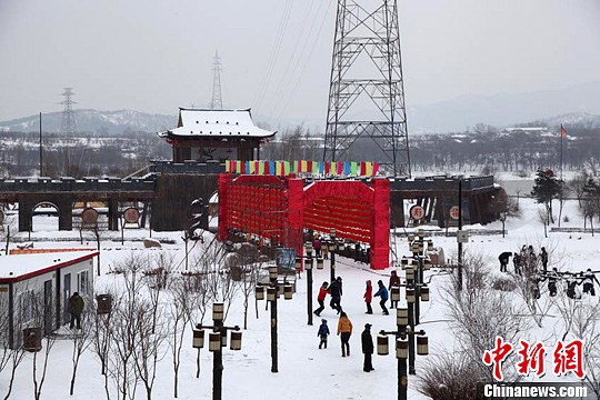 12月26日,吉林市松花江边的乌喇主题公园充溢着孩童的笑声,由1400盏红灯笼组成的“灯笼门”透出浓浓的年味,吸引大批市民来拍照观赏。苍雁 摄