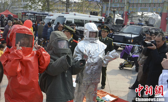 12月27日,广东肇庆市、县、镇三级同时举行主题为“全民参与创平安 众志成城筑和谐”的“创建平安肇庆”宣传日活动,并以图片展、面对面咨询点、演示区等形式,向市民宣传平安肇庆建设。图为现场市民模拟穿上消防服等各种防护服装。中新社发 黄耀辉 摄