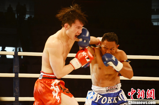 图为中国选手韩开湖(左)迎战泰拳选手成洛(右)。中新社发 程景伟 摄