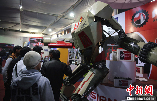 图为参展企业以变形金刚模型吸引尼泊尔民众。中新社发 符永康 摄