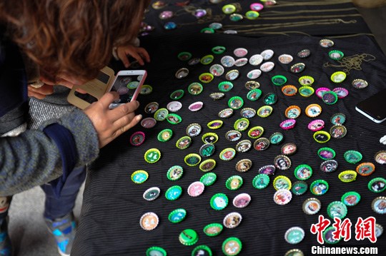 1月4日,用啤酒瓶盖做的胸针吸引女孩的目光。当日,海鸥创意市集在昆明翠湖公园内开市,各具特色的创意产品让众多市民流连忘返。中新社发 刘冉阳 摄
