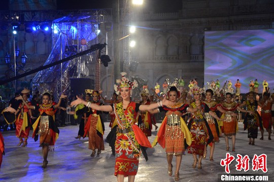 1月4日晚,2014马来西亚旅游年盛大开幕庆典在首都吉隆坡独立广场举行,当地艺术家敞开怀抱欢迎世界游客。中新社发 黄鸿斌 摄